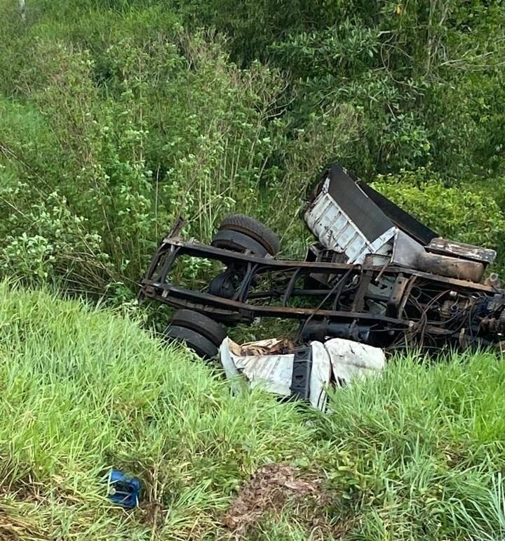 Motorista perde controle e capota caçamba na BR-364; vítima é encaminhada a hospital