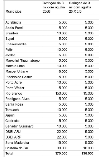 Todos os municípios acreanos serão contemplados com o material, conforme tabela abaixo: