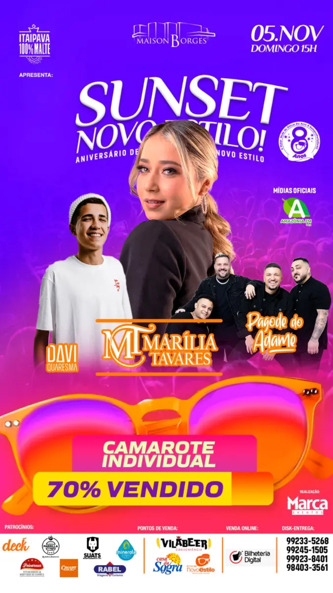 A apresentação de Marília Tavares no Acre está agendada para o dia 5 de novembro e acontecerá no prestigiado Maison Borges. Os ingressos para o evento “Sunset Novo Estilo” estão voando das prateleiras, já no segundo lote, com incríveis 70% dos camarotes vendidos. O show tem previsão de início às 15h e promete uma tarde memorável, contando também com as presenças de Davi Quaresma e o grupo Pagode do Adame no palco. Veja mais informações: