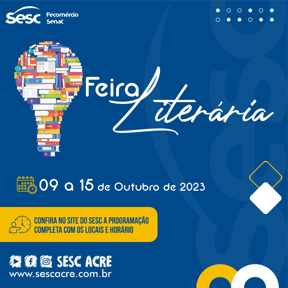 O Serviço Social do Comércio no Acre (Sesc no Acre) realiza feira literária até o domingo, 15 de outubro, em vários locais da cidade de Rio Branco. Os horários vão das 8 horas às 21 horas para escolas agendadas e público em geral, com escritores, quadrinistas e grupos de literatura. A entrada é gratuita.