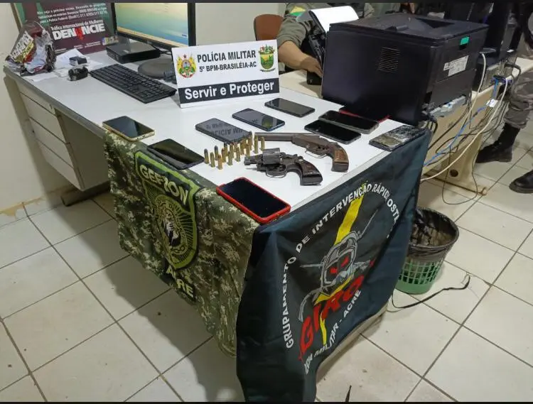 Ainda durante as buscas foi localizada duas armas de fogo, 10 aparelhos possivelmente provenientes de roubos, além de munições. Os três que informaram pertencer uma organização criminosa que atua na fronteira foram encaminhados a delegacia de Brasileia.
