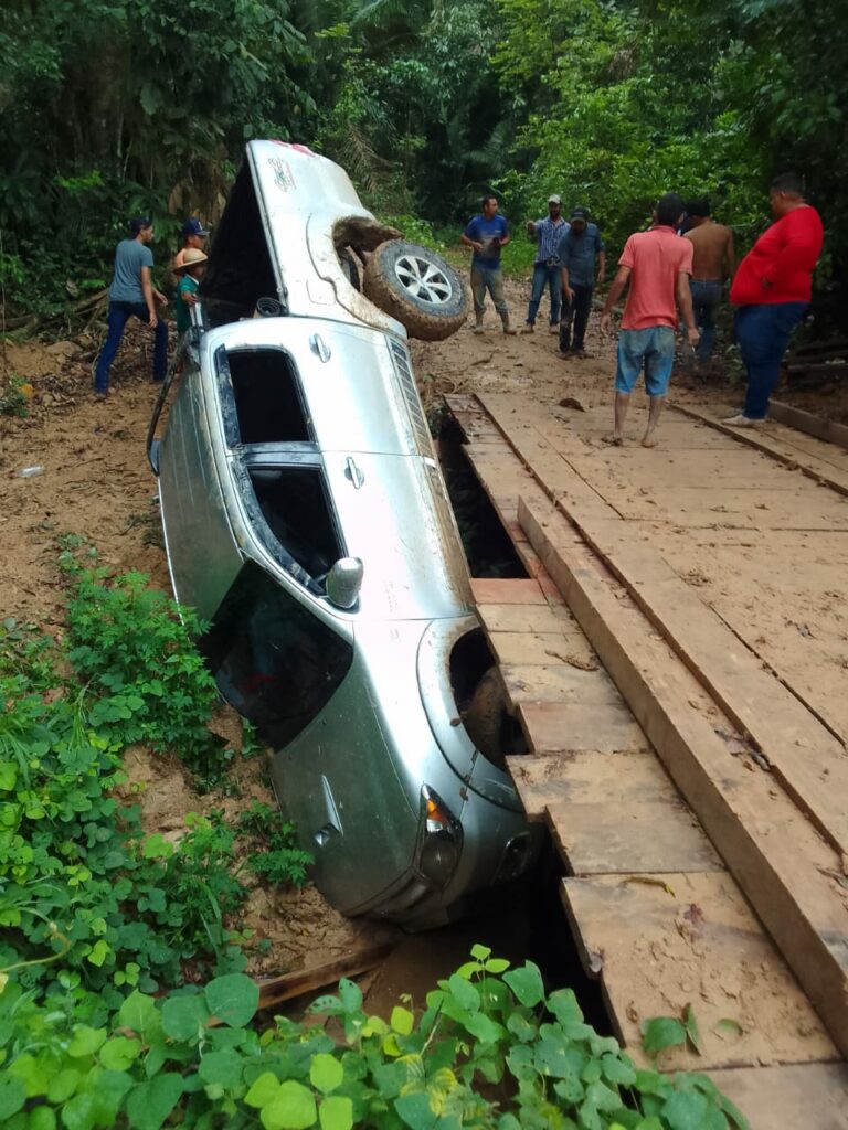 Uma caminhonete modelo Hilux, de cor prata, acabou caindo em um barranco ao tentar atravessar uma ponte no ramal que dá acesso à comunidade Lua Nova, no Rio Macauã, em Sena Madureira. O caso aconteceu na manhã deste sábado (14).