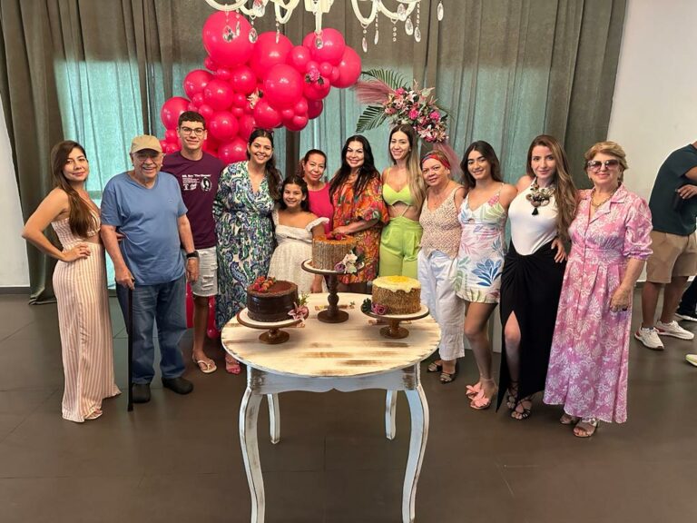 Família: a prima Jessica Vale, o pai Osmir Lima, o sobrinho Eduardo Borges, a filha Karenna Lima, a sobrinha Isabela Borges, a irmã Soraya Lima, a aniversariante, a sobrinha Tabata Lima, a tia Dione Lima, a nora Maria Beatriz, a prima Sofia Brunetta, e a tia Sueli Vale.