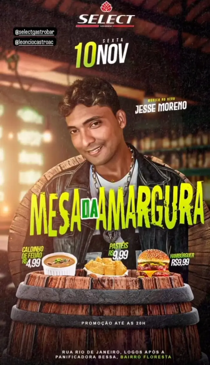 Mesa da Amargura com música ao vivo, na sexta-feira (10), no Select Gastrobar.