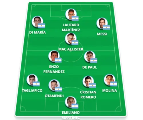 Provável escalação: Emiliano Martínez, Molina, Cristian Romero, Otamendi e Tagliafico; Enzo Fernandez, De Paul e Mac Allister; Messi, Di María e Lautaro Martínez.