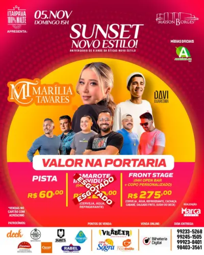A Sunset Novo Estilo já fez história ao esgotar seus camarotes individuais, demonstrando a grande expectativa em torno do evento. Para aqueles que ainda desejam participar do evento, ainda é possível adquirir ingressos para a pista e o front stage na portaria.