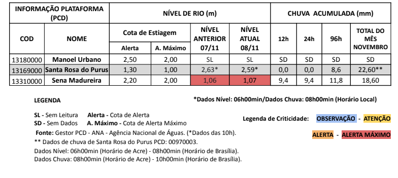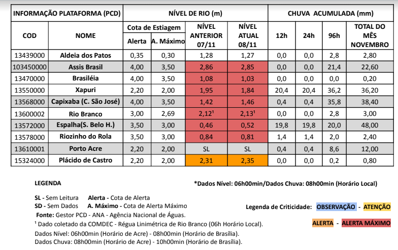 De acordo com os dados, o principal rio de Assis Brasil, Brasiléia, Xapuri, Rio Branco e Sena Madureira, além dos pontos de monitoramento do Ramal Espalha (na região do Seringal Belo Horizonte), Riozinho do Rola, Capixaba (C. São José), registraram níveis abaixo das cotas de alerta e alerta máximo.