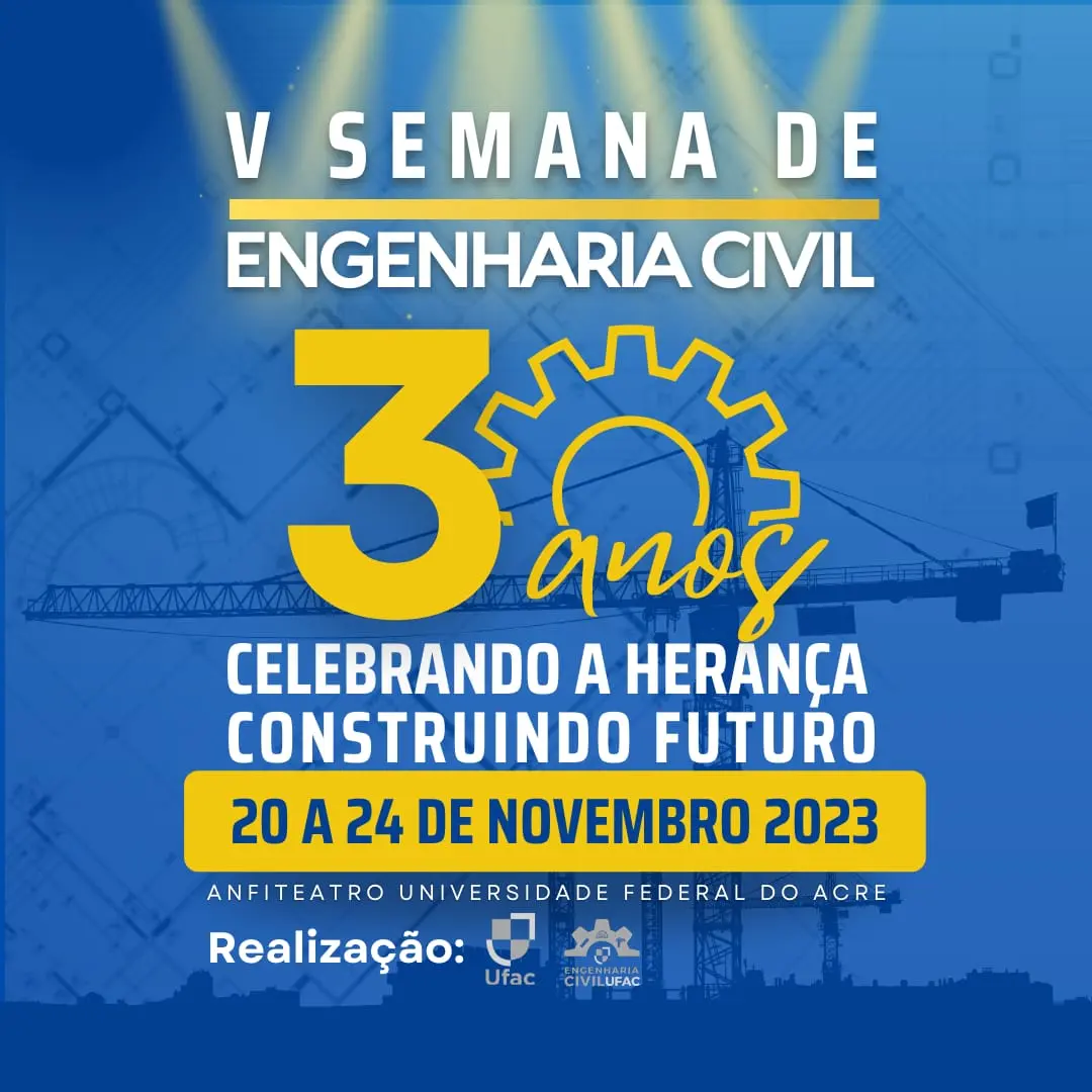 Em sua quinta edição, a Semana de Engenharia Civil (V SEC), da Universidade Federal do Acre (Ufac), marca a celebração de 30 anos de existência do curso na instituição. O evento acontece do dia 20 ao dia 24 de novembro, no Anfiteatro Garibaldi Brasil, na Ufac.