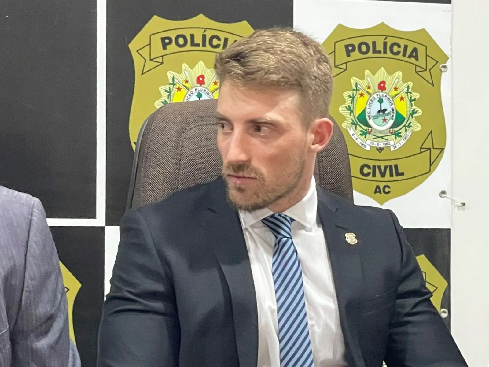 Delegado Felipe Fachinelli durante coletiva nesta quinta (30)/Foto: Matheus Mello/ContilNet