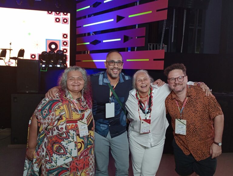 Na foto, comitiva acreana composta por Karla Martins, Sérgio de Carvalho e Clemilson Farais posa ao lado da cantora Fafá de Belém, durante a terceira edição do Mercado das Indústrias Criativas do Brasil (MICBR) que acontece em Belém. O evento, um grandioso encontro de negócios culturais, marca sua estreia na região amazônica e é promovido pelo Ministério da Cultura (MinC) em parceria com a Organização de Estados Ibero-americanos (OEI). As atividades têm lugar no Hangar Centro de Convenções.