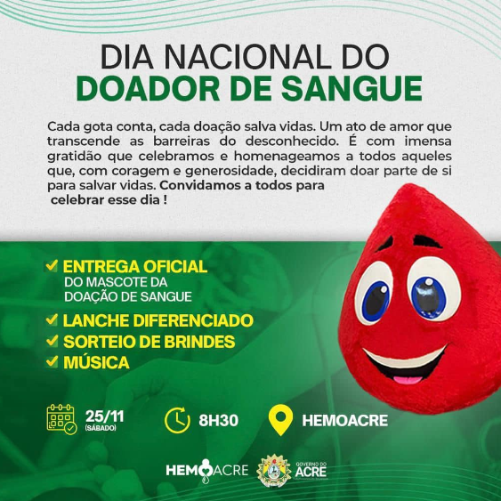 No sábado (25), o Hemoacre estará com uma programação especial para receber os doadores, que contará com sorteio de brindes, lanches e músicas, a partir das 9h.