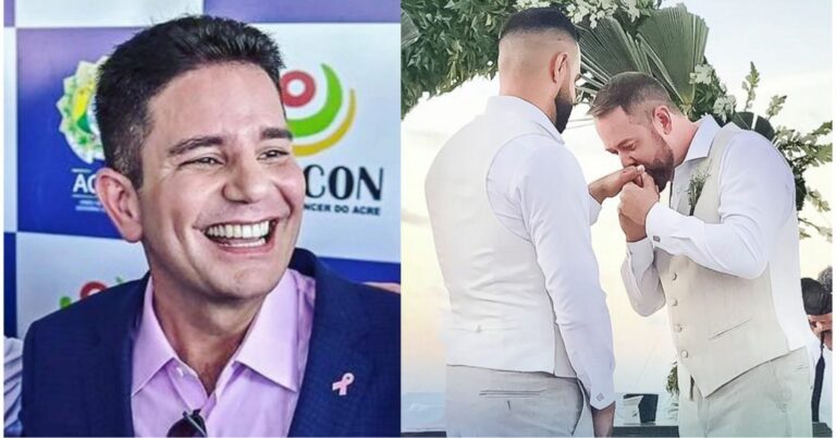 O governador Gladson Cameli utilizou suas redes sociais para compartilhar os momentos especiais do casamento do secretário de Estado de Turismo e Empreendedorismo, Marcelo Messias, que formalizou sua união com o arquiteto acreano Leandro Rocha em uma suntuosa celebração na praia de Presídio, em Aquiraz, Ceará, na tarde da última quinta-feira (16). Em sua legenda, Gladson destacou a trajetória do casal, elogiando a resiliência e afirmando que toda forma de amor é digna de celebração. Parabenizou ainda a persistência mútua no amor. Confira a legenda usada pelo governador Gladson Cameli: