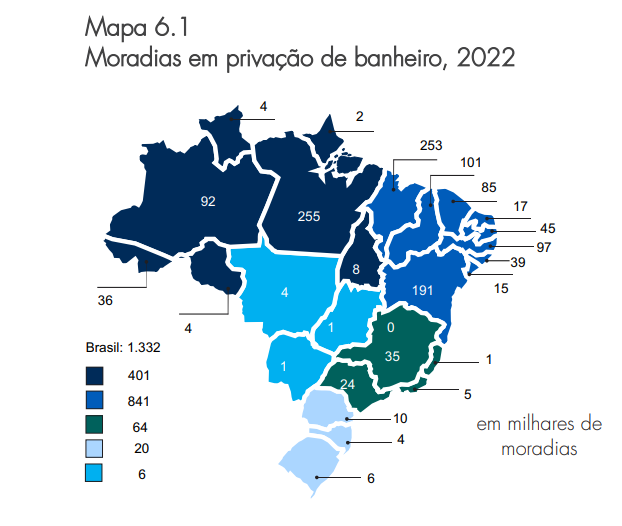 O Norte apareceu com 401 mil moradias sem banheiro de uso exclusivo, o que correspondeu a 30,1% do total nacional. Neste caso, contudo, a parcela que essas moradias representam no total de habitações foi ainda maior do que a nordestina: 7 a cada 100 domicílios do Norte não dispunham de banheiro de uso exclusivo em 2022. Os maiores problemas estavam nos estados do Pará e Amazonas, onde se situavam respectivamente 255 mil e 92 mil residências sem banheiro de uso exclusivo