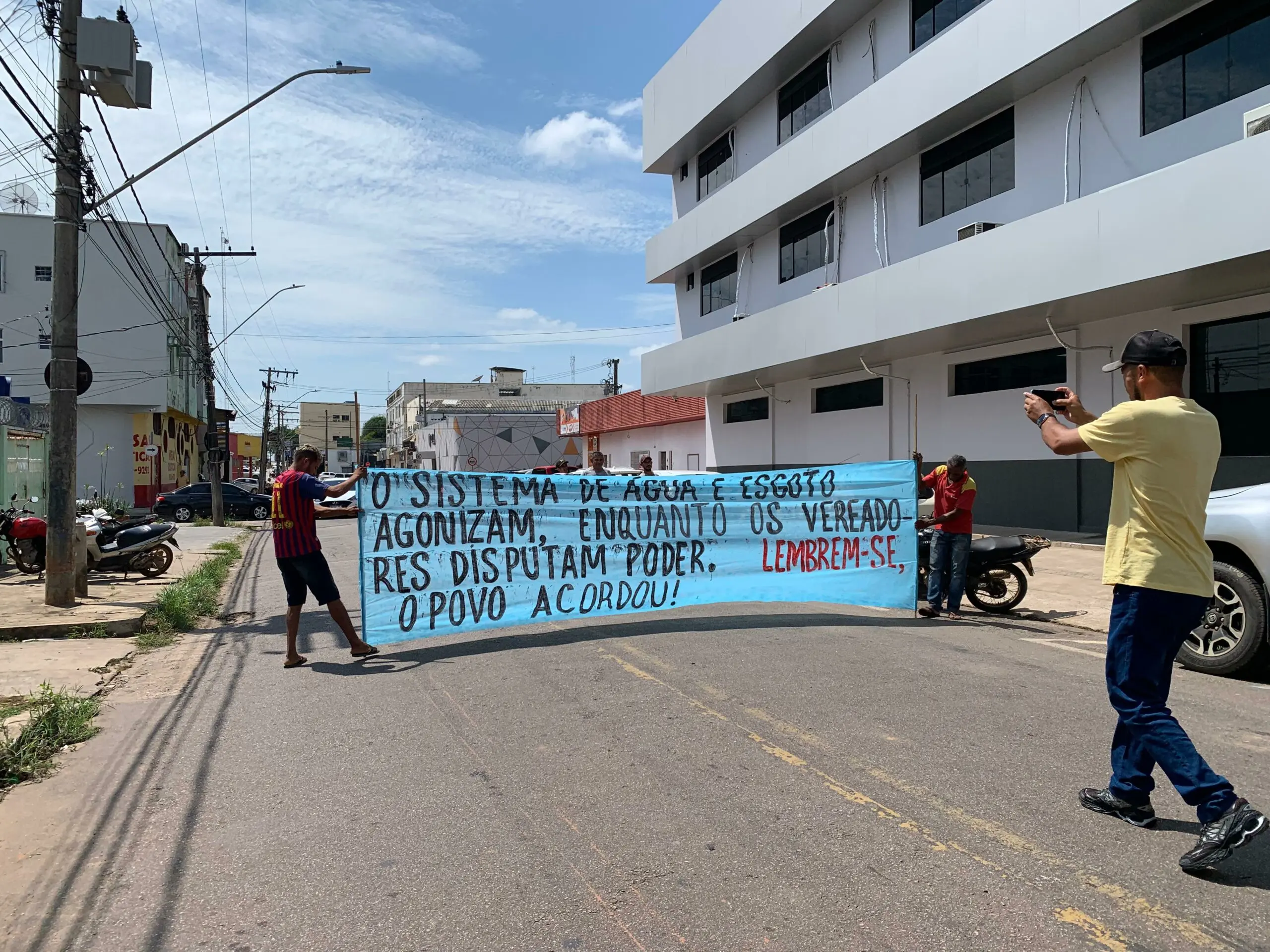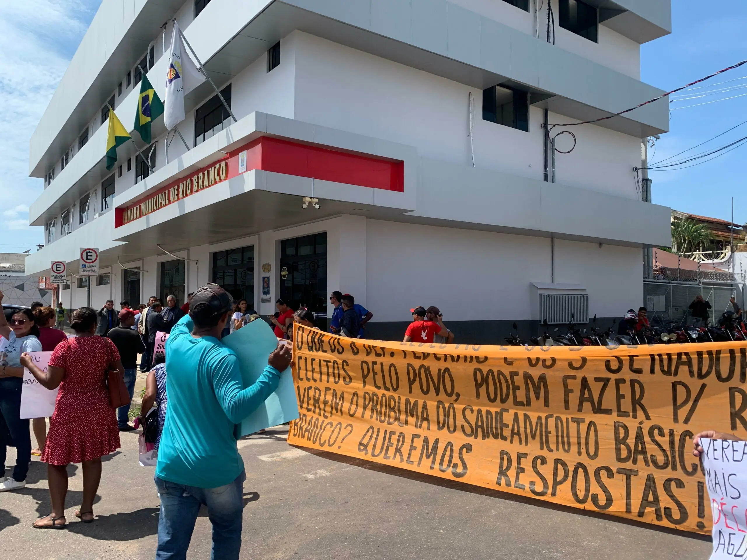 Um grupo de manifestantes fecharam a rua que dá acesso à Câmara Municipal de Rio Branco nesta terça-feira (28), exigindo que os vereadores da capital ajude a Prefeitura a melhorar o sistema de água e esgoto da cidade.