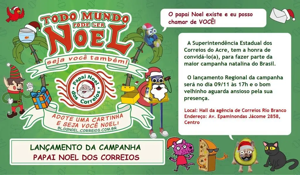 A Campanha Papai Noel dos Correios será lançada nesta quinta-feira (9), em Rio Branco. Com 1300 cartinhas já recebidas, o projeto terá o ponta-pé inicial no hall da agência dos Correios, localizada na Avenida Epaminondas Jácome, Centro, às 17 horas.