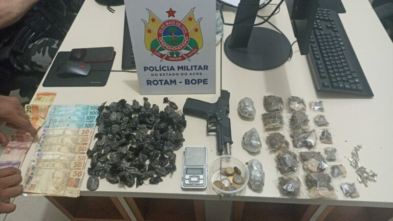Equipes de Rondas Ostensivas Tático Móvel (Rotam/Bope) da Polícia Militar do Acre (PMAC) desarticularam na noite desta sexta-feira, 17, um ponto de venda de drogas em Rio Branco e apreenderam uma arma de fogo adaptada. O fato ocorreu no Bairro Habitasa, onde um homem foi preso e uma adolescente apreendida.