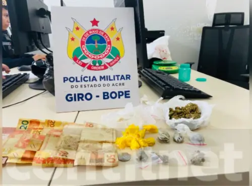 Durante abordagem, os agentes encontraram quase 50 gramas de substâncias aparentando ser Skank, seis gramas de substâncias aparentando ser cocaína, uma pequena quantidade de oxidado de cocaína e uma quantia em dinheiro, mais material para embalagem do entorpecente.