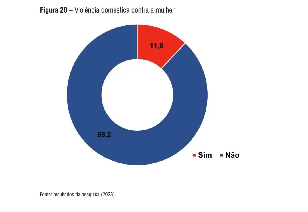 Já os dados referentes à violência contra a mulher mostram que, do total entrevistado, 11,8% sofreu algum tipo de violência dentro de casa. As entrevistadas falaram que 44,0% de seus agressores foram cônjuge, 36% foram seus ex-cônjuges, 8% irmãos e 4% seus pais, mães e avós.