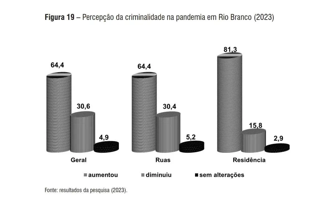 Na última terça-feira (7), o relatório da Pesquisa de Percepção de Insegurança da População na cidade de Rio Branco entre 2019 e 2022 revela que, segundo os dados apresentados, 81,3% dos entrevistados têm a percepção de que a violência aumentou dentro das suas casas. A pesquisa foi realizada pelo Ministério Público do Estado do Acre (MPAC), por meio da Promotoria Especializada de Tutela do Direito Difuso à Segurança Pública.