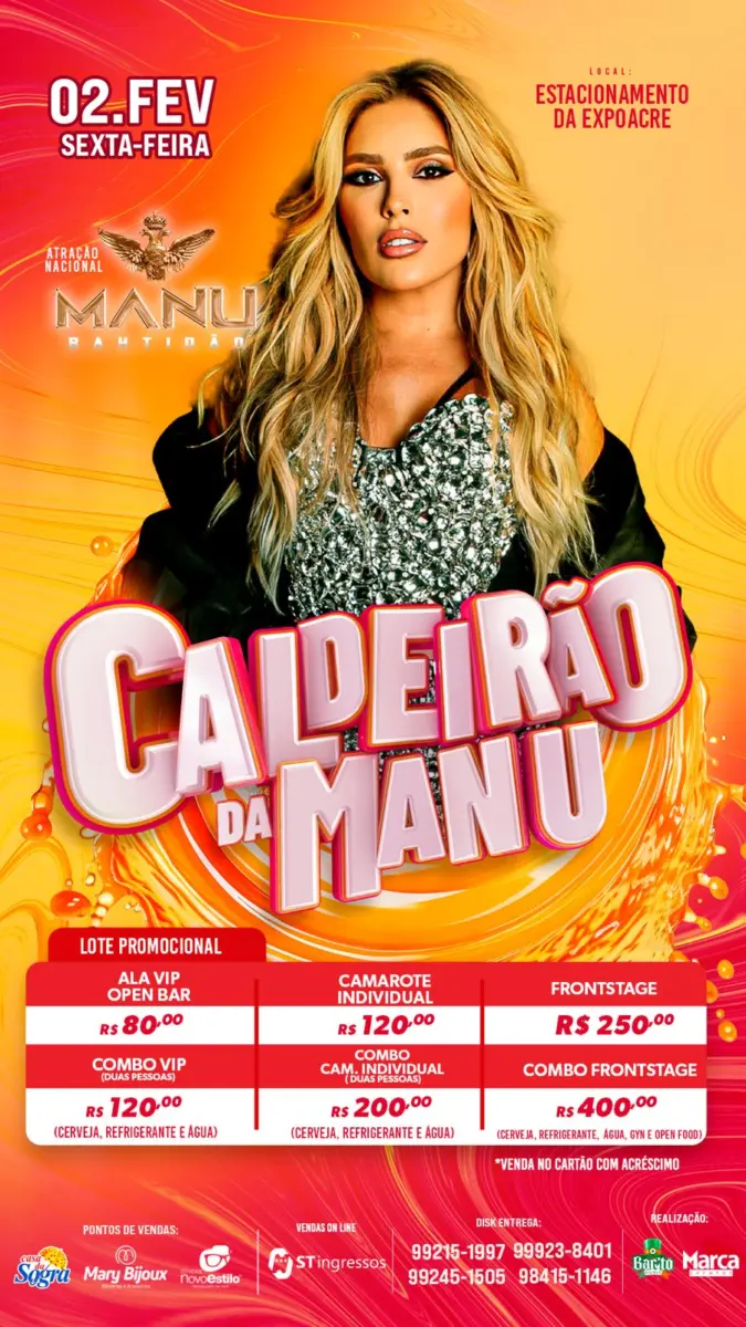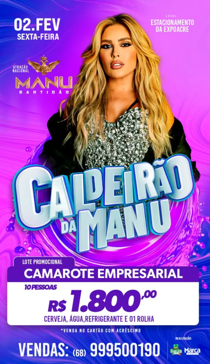 Um dos shows mais comentados no Acre é o da cantora Manu Bahtidão, marcado para o dia 2 de fevereiro de 2024, no estacionamento da ExpoAcre. Nesta terça-feira (28), a organização do evento anunciou a venda dos primeiros ingressos, pertencentes ao lote promocional. Segundo as empresas organizadoras Bartô Music e Marcas Eventos, os ingressos variam de $80 a $250 reais. Já o camarote empresarial custa R$1.800 reais.