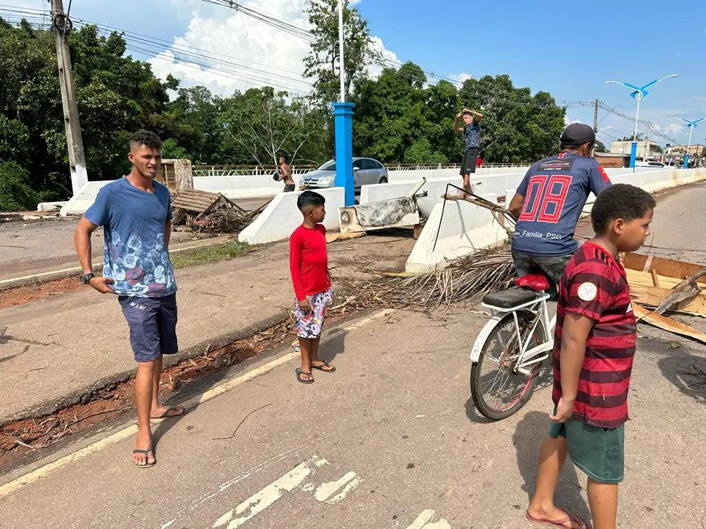 Moradores do Bairro da Paz fecharam a ponte sobre o Igarapé Batista, na Rua Valdomiro Lopes, no início da tarde desta terça-feira (28). Os moradores voltaram a fechar o trecho da rua em protesto pela demora da entrega dos móveis e eletrodomésticos do Programa Recomeço para as Famílias 2023, da Prefeitura de Rio Branco, que dá os objetos as famílias que tiveram as casas atingidas pela enchente em Rio Branco.