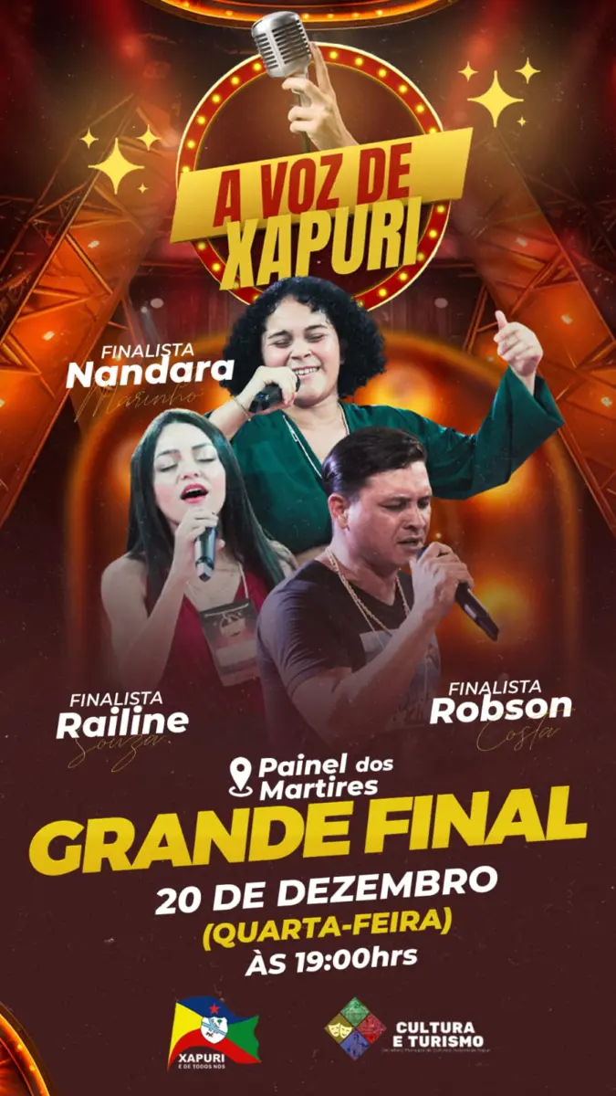 Para a final do festival restam 03 candidatos selecionados, sendo eles Robson Costa, Railine e Nandara Marinho, que disputarão a grande final do festival “A voz de Xapuri” em uma seleção a ocorrer na próxima quarta-feira (20), que promete um grande espetáculo e muita emoção.