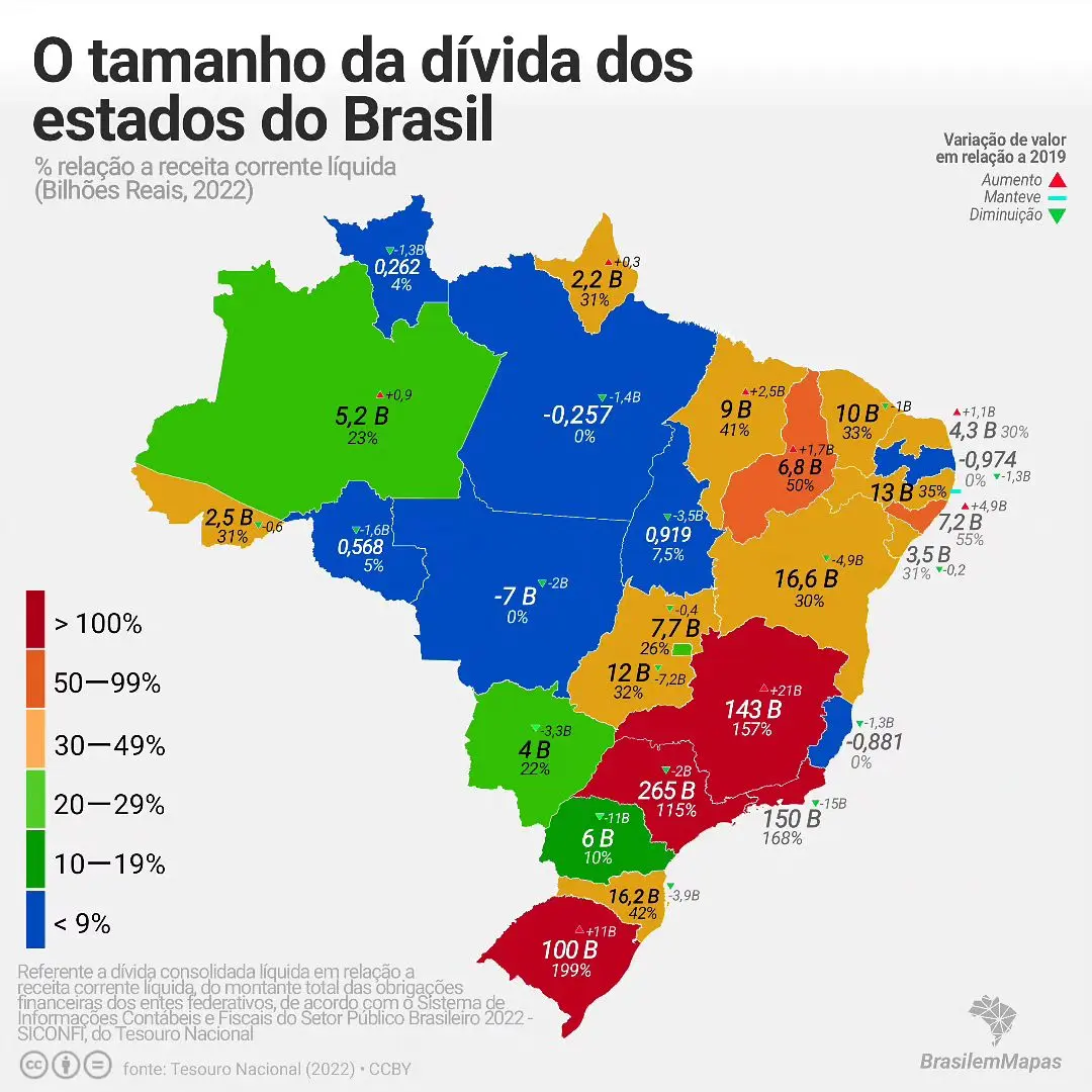 O estudo também apresentou um panorama nacional das dívidas estaduais em relação à receita corrente líquida, considerando dados de 2022 e a variação percentual desde 2019. São Paulo, apesar de liderar em arrecadação, é apontado como o estado mais endividado, com R$ 265 bilhões em dívidas, representando 115% de sua receita. O estado, no entanto, registrou uma redução de R$ 2 bilhões em relação a 2019.