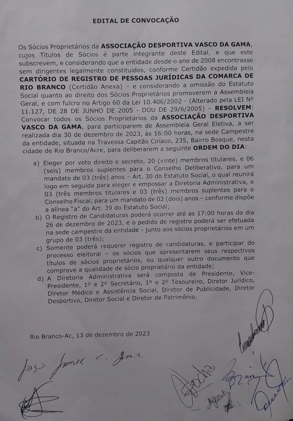 Os sócios proprietários da Associação Desportiva Vasco da Gama convocaram os demais sócios para uma Assembleia Extraordinária para discutir os termos da próxima eleição presidencial que determinará o líder do triênio 2024-2026.