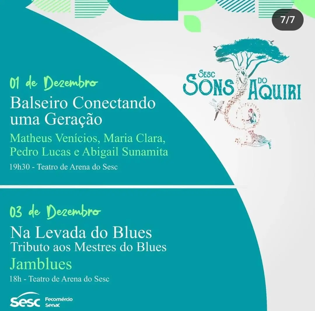 Últimos shows do festival Sons do Aquiri no Sesc. Sexta (1), show “Balseiro Conectando uma Geração”, às 19h30, com os artistas Matheus Venícios, Maria Clara, Pedro Lucas e Abigail Sunamita. No domingo (3), às 18h, show “Na Levada do Blues: Tributo aos Mestres do Blues” com JamBlues. No Teatro de Arena do Sesc.