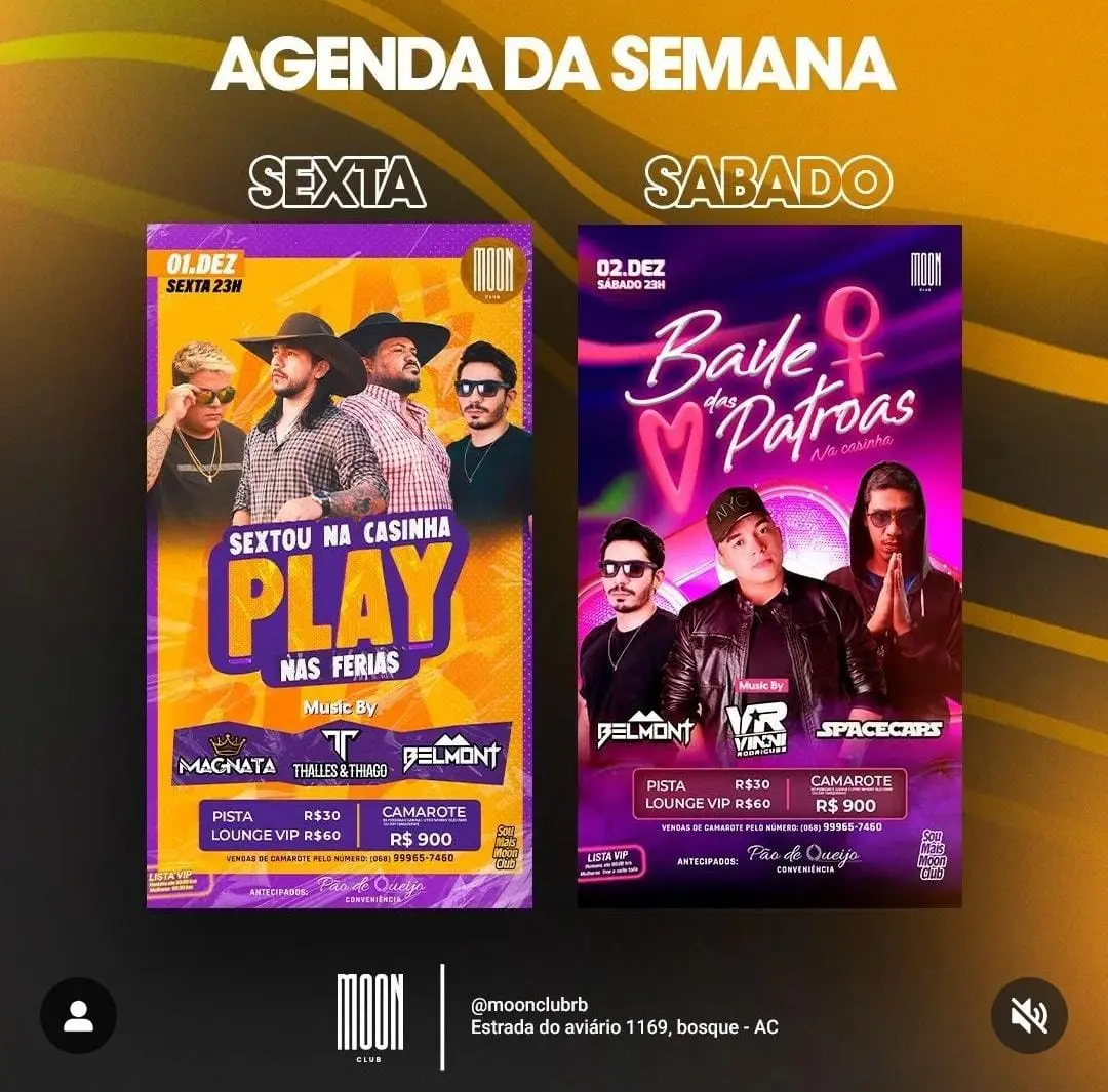 Dos eventos que se destacam, temos o “Dia do Samba” no Quintal dos Brothers, Play nas Férias e Baile das Patroas na Moon Club, shows variados todo final de semana na Confraria GastroBar, além de outras programações dos mais diversos nichos nos lugares de festa em Rio Branco.