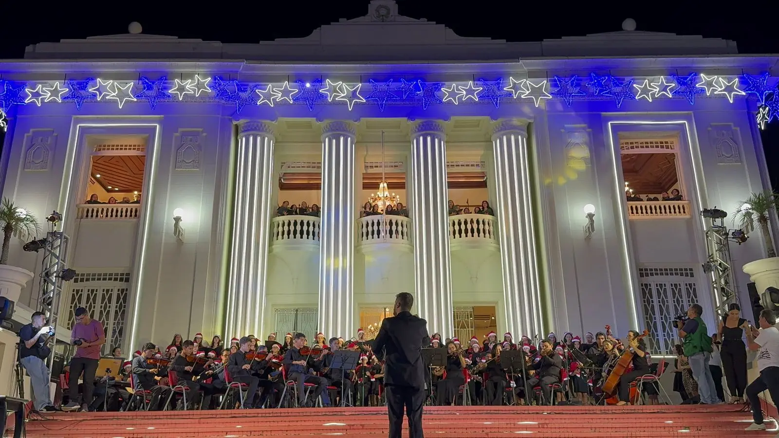 Para a apresentação, um grupo de crianças ficaram posicionados nas janelas do Palácio e nas escadarias ficaramos adolescentes, seguido da banda com um professor e a regência no último andar. Foram apresentados oito clássicos natalinos.