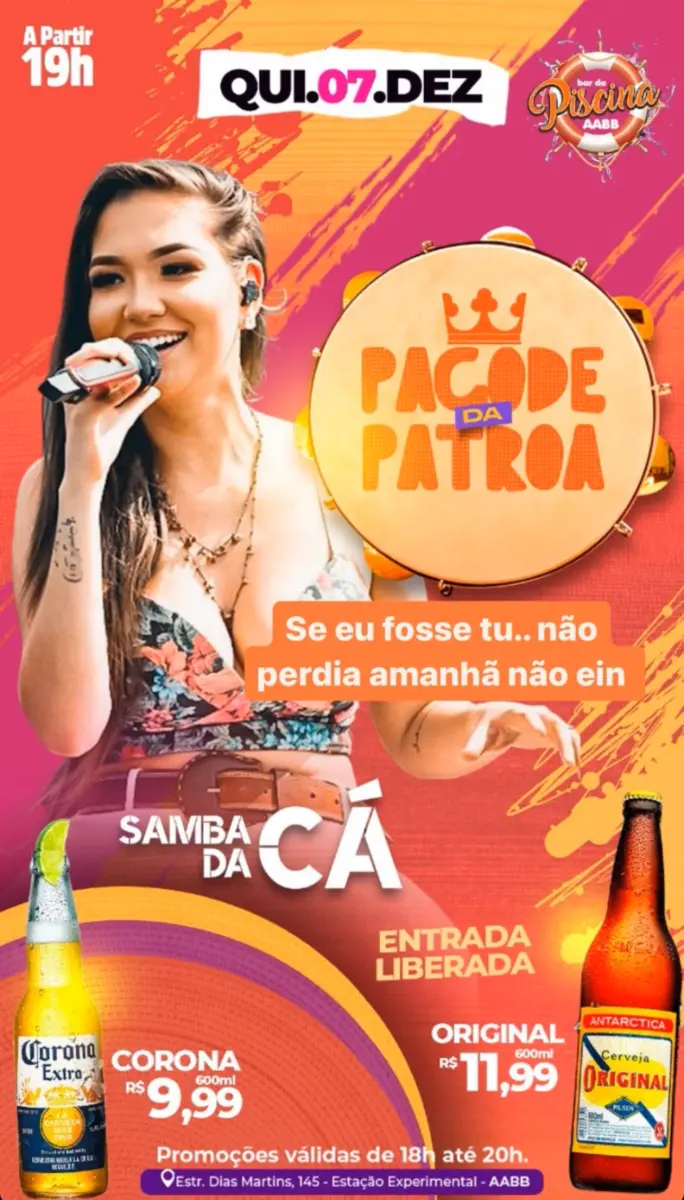 Com mais de 19 mil seguidores, Camile deu um spoiler aos seus fãs. A cantora se apresentará nesta quinta-feira (7) no Bar da Piscina da AABB no ‘Pagode da Patroa’ com seu famoso ‘Samba da Cá’.