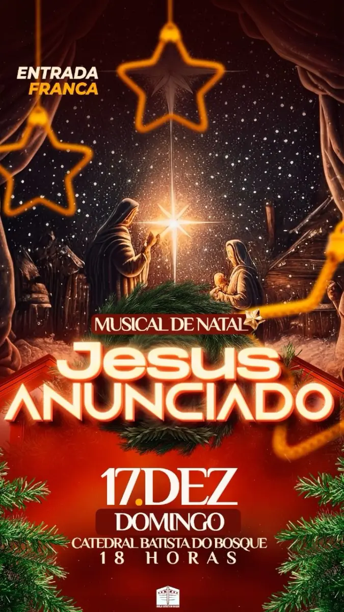 O evento terá início às 18:00h, com entrada gratuita na Catedral Batista do Bosque, localizada na Estrada do Calafate N 1505, ao lado da Havan. Siga a Catedral Batista do Bosque no Instagram, clique AQUI!