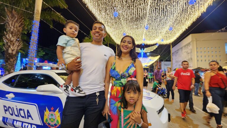 O pai do bebê, Matheus Caio, está visitando a praça ornamentada pela primeira vez em 2023 e ressaltou que a decoração está linda. “A iluminação ficou bacana e a ornamentação tá bem feita, trabalhou bacana esse ano”, declarou.