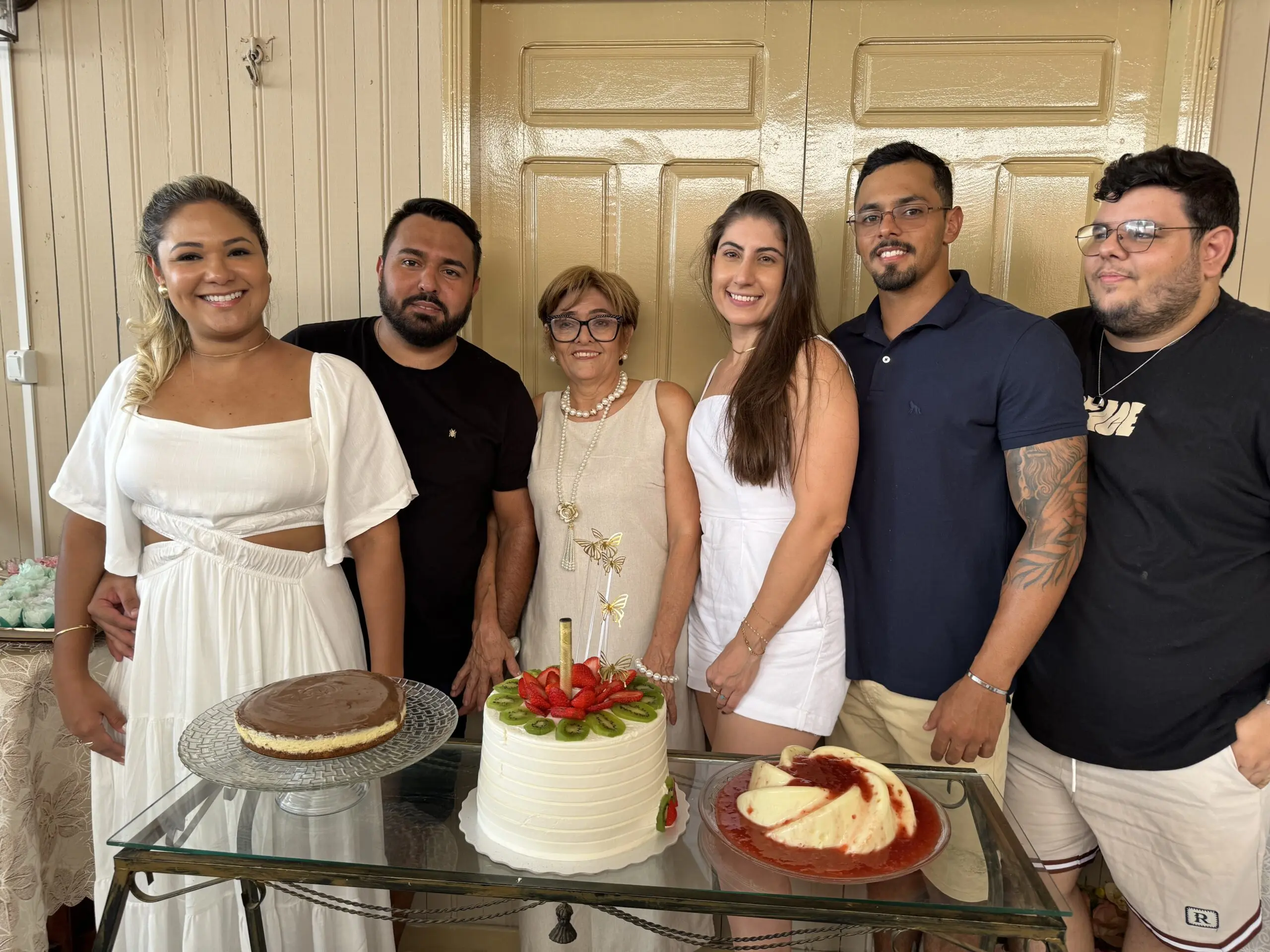 Acompanhada dos filhos Kaio, Gabriel e Ariel, do esposo Célio, das irmãs Karlacy e Alexandrina, e do pai Tião Lucena, Karluzie celebrou a data especial ao som do tradicional “Parabéns”, acompanhado por um bolo decorado, docinhos e uma variedade de quitutes.