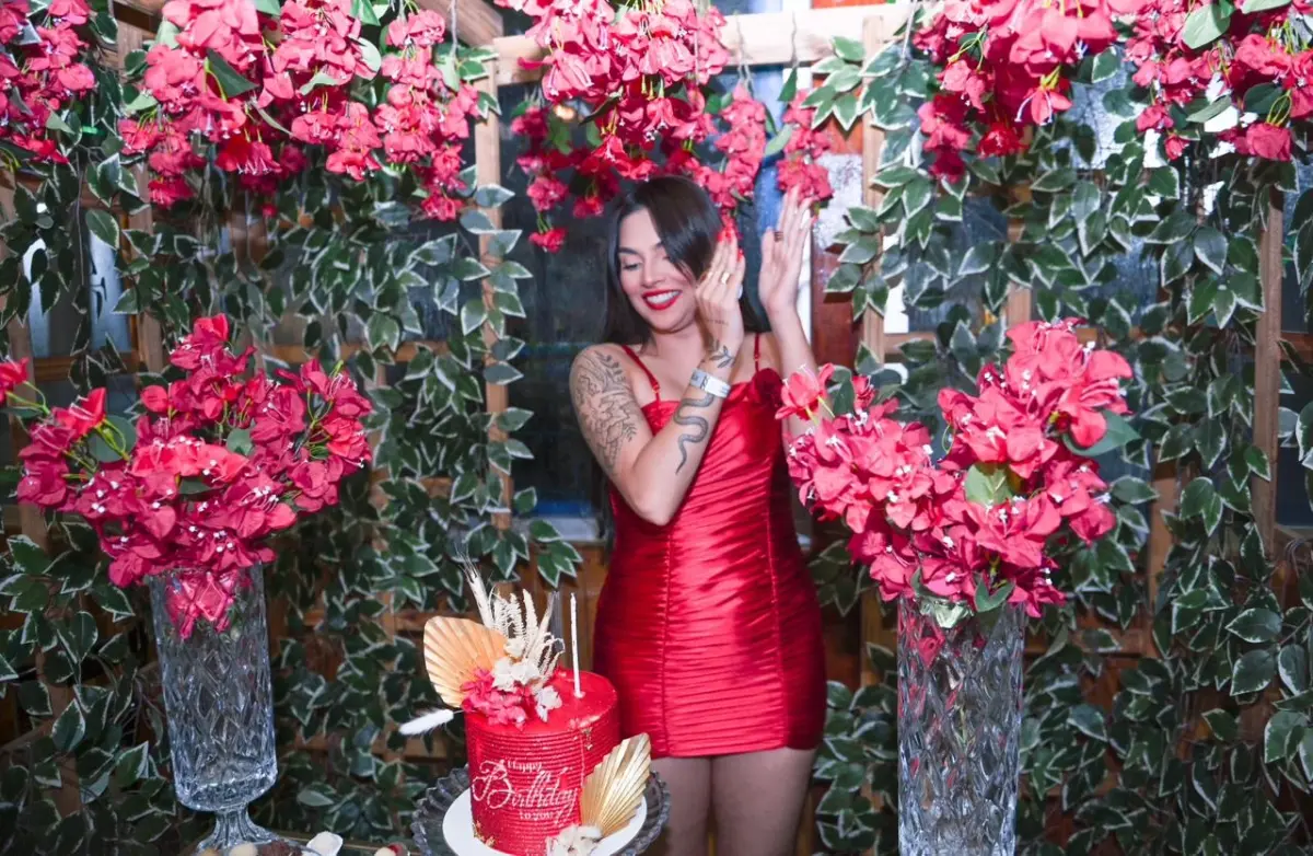 A acreana usou vermelho e acessórios dourados para comemorar a nova idade. Ludmilla Cavalcante compartilhou alguns cliques da festa exclusivamente para a coluna Douglas Richer, do portal ContilNet: