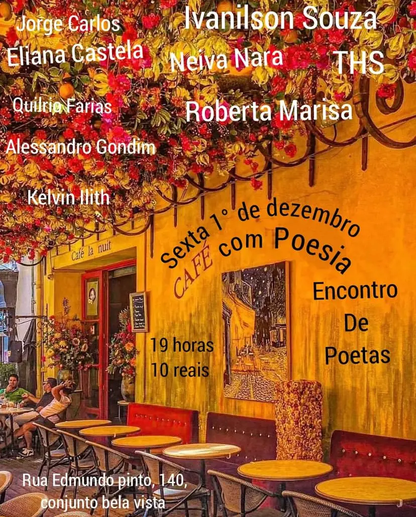 Nesta sexta-feira, às 19 horas, tem Encontro de Poetas, no Café com Poesia. Os escritores e escritoras locais: Jorge Carlos, Eliana Castela, Quilrio Farias, Alessandro Gondim, Kelvin Ilith, Ivanilson Souza, Neiva Nara, THS e Roberta Marisa irão expor seus livros e declamar poesias para os amantes das rimas.