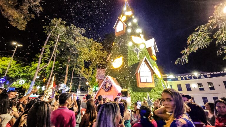 Mesmo com este sábado (9) marcando mais de 30°C nos termômetros, a A decoração de Natal da Prefeitura de Rio Branco fez nevar na Praça da Revolução.
