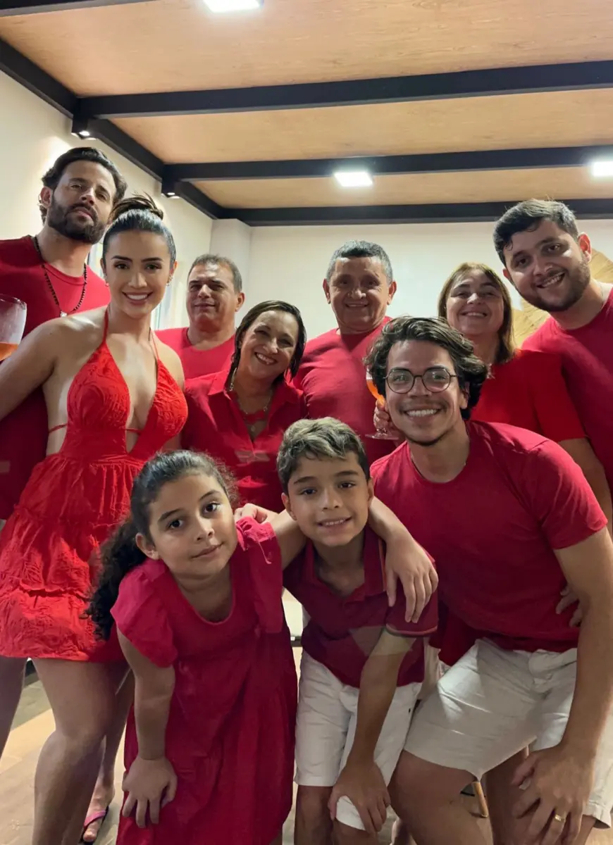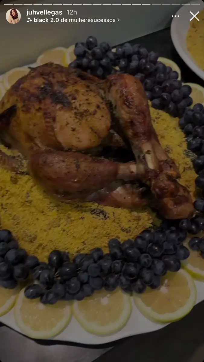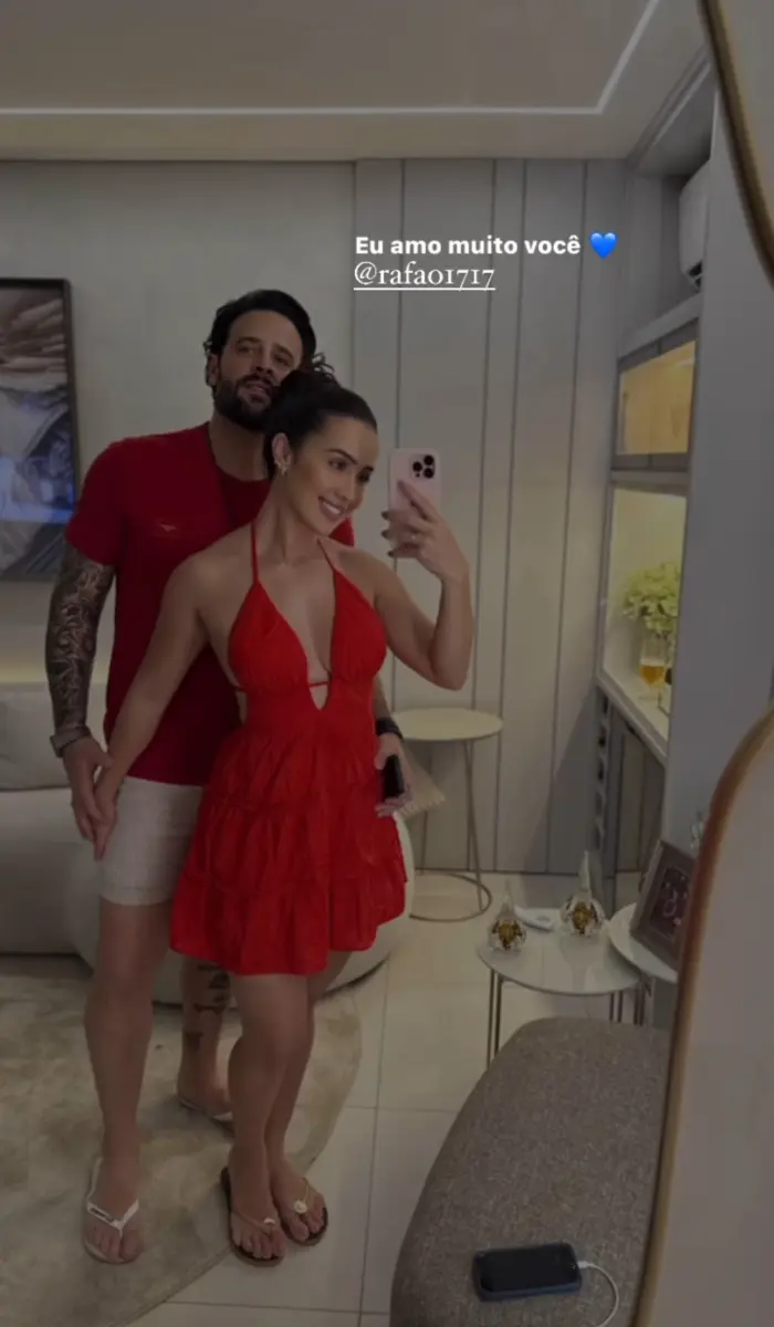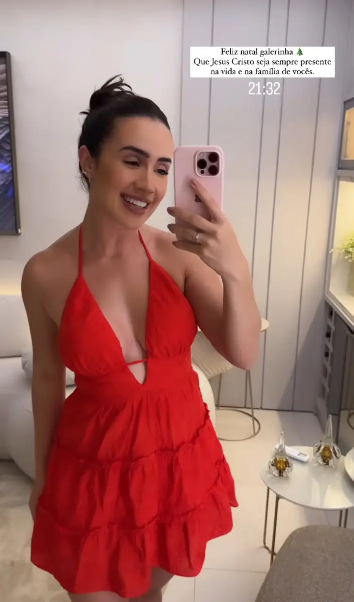 Em seu perfil em uma rede social, a influenciadora Juh Vellegas gravou um vídeo para desejar boas festas aos seguidores e escolheu um look tradicional vermelho. A influenciadora ainda mostrou sua mesa posta e parte da ceia de Natal do casal, com muitas guloseimas.