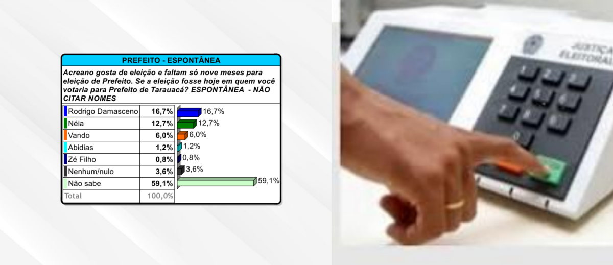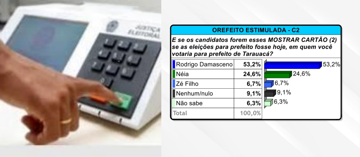 De acordo com os números, Rodrigo Damasceno lidera a pesquisa, na espontânea, com 16,7% e, na estimulada, com 53,2%. A pesquisa também quis saber o índice de rejeição de todos os cinco pré-candidatos à Prefeitura de Tarauacá.