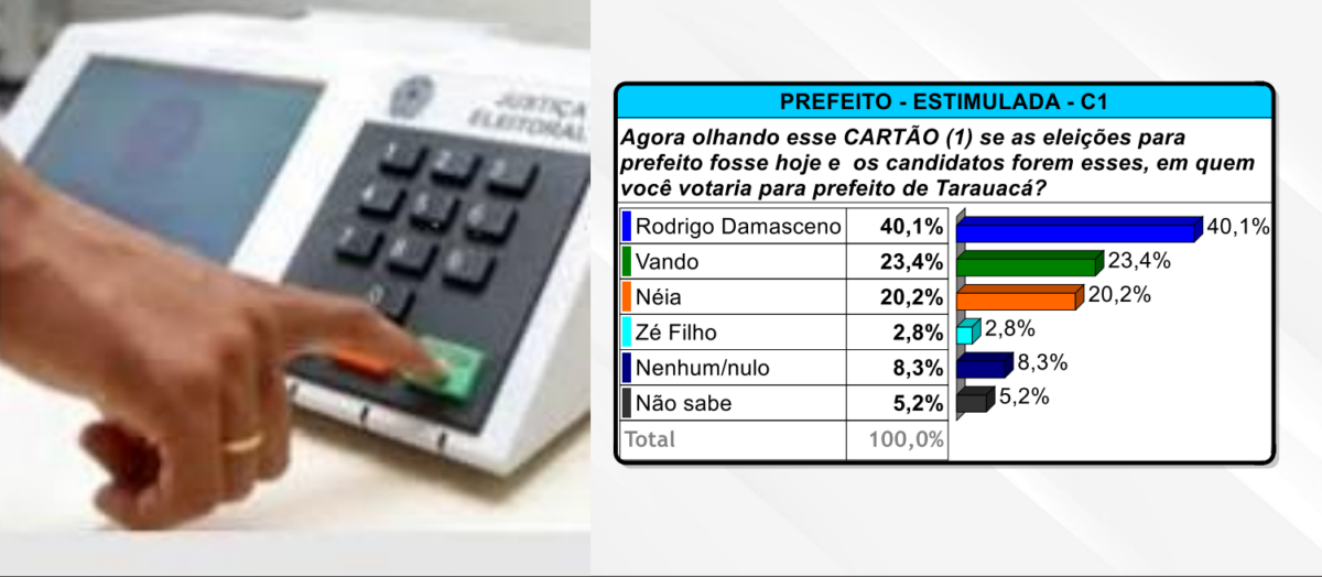 O médico Rodrigo Damasceno, ex-prefeito de Tarauacá, lidera os números da mais recente pesquisa de opinião pública sobre às eleições municiais de 2024, para voltar ao cargo.  A liderança do ex-prefeito é registrada tanto na pesquisa espontânea (quando os nomes dos pré-candidatos não são revelados pelo entrevistador) como também na estimulada, quando os nomes são citados.