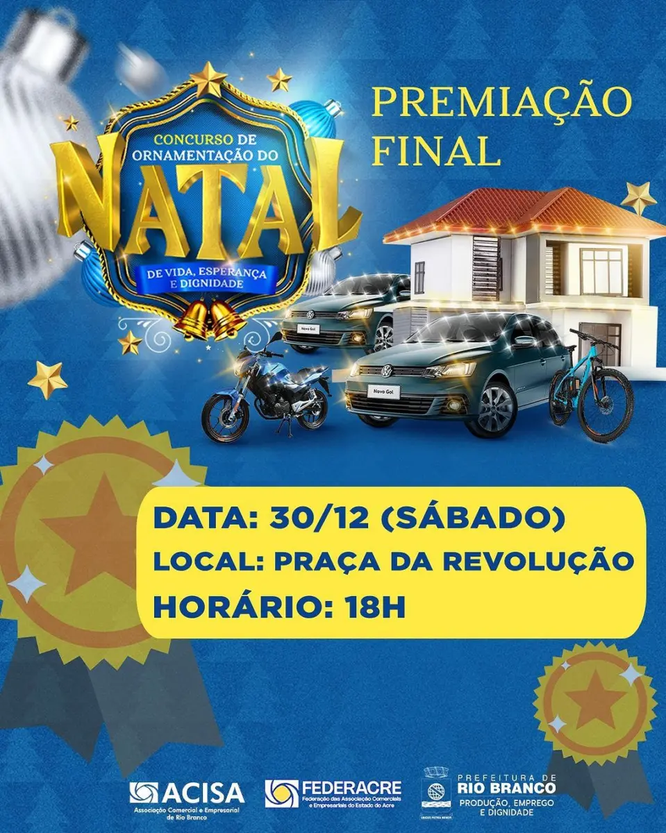 A Prefeitura de Rio Branco vai premiar, neste sábado (30), os vencedores do Concurso de Ornamentação de Natal de Vida, Esperança e Dignidade 2023. A cerimônia de anúncio e premiação dos ganhadores acontece na Praça da Revolução, às 18h.