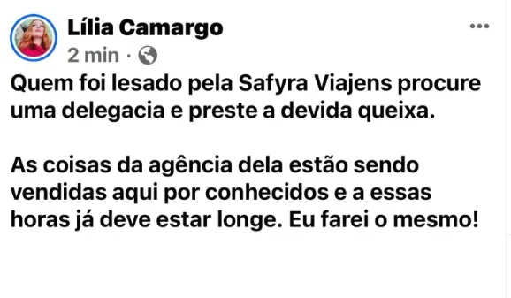 Em suas redes sociais nesta quarta-feira (20), a influenciadora e jornalista Lília Camargo relatou que comprou uma viagem para esse final de ano com destino a Porto Seguro (BA) para as festividades, mas desde semana passada não consegue obter contato com a dona da Agência Safyra Viagens.