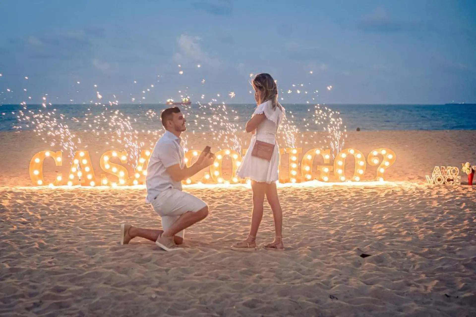 O pedido de casamento foi feito no pôr do sol, com direito a letreiro com a frase CASA COMIGO. O empresário disse que sempre sonhou com que o pedido fosse feito em uma praia.“Eu queria fazer um negócio muito bonito e fazer o pedido na praia é muito diferente, porque a gente não tem praia lá no Acre. A praia mais perto fica no Peru. Antes de comprar as passagens para Fortaleza, eu já tinha interesse em fazer o pedido aqui na praia”.