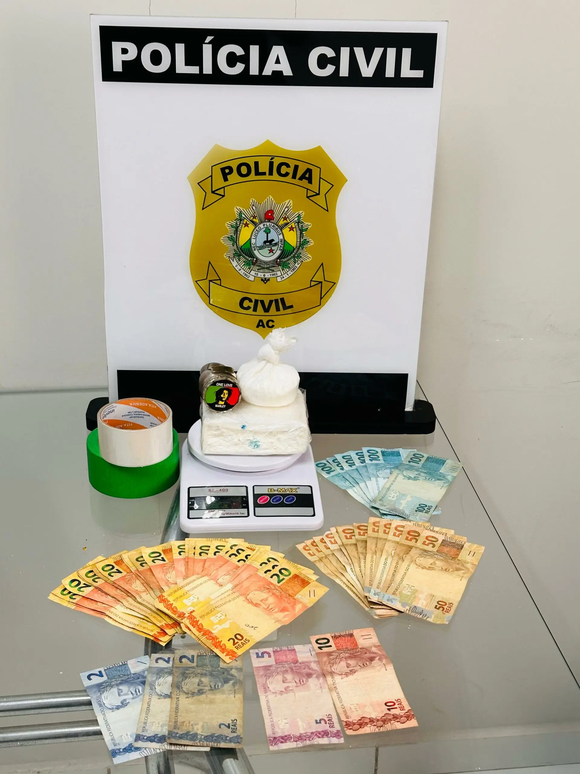 No ato da prisão do investigado, os policiais encontraram no interior no imóvel: uma barra de uma substância esbranquiçada, aparentando ser cocaína; um invólucro plástico contendo em seu interior um pó esbranquiçado também aparentando ser cocaína, uma balança de precisão, 01 dichavador contendo 04 porções de uma substância esverdeada, aparentando ser maconha e a quantia de R$ 1.731,00 em espécie.