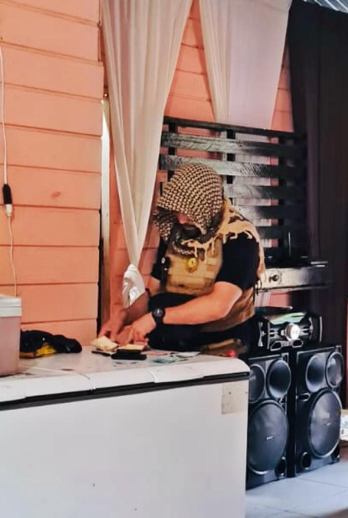 No ato da prisão do investigado, os policiais encontraram no interior no imóvel: uma barra de uma substância esbranquiçada, aparentando ser cocaína; um invólucro plástico contendo em seu interior um pó esbranquiçado também aparentando ser cocaína, uma balança de precisão, 01 dichavador contendo 04 porções de uma substância esverdeada, aparentando ser maconha e a quantia de R$ 1.731,00 em espécie.