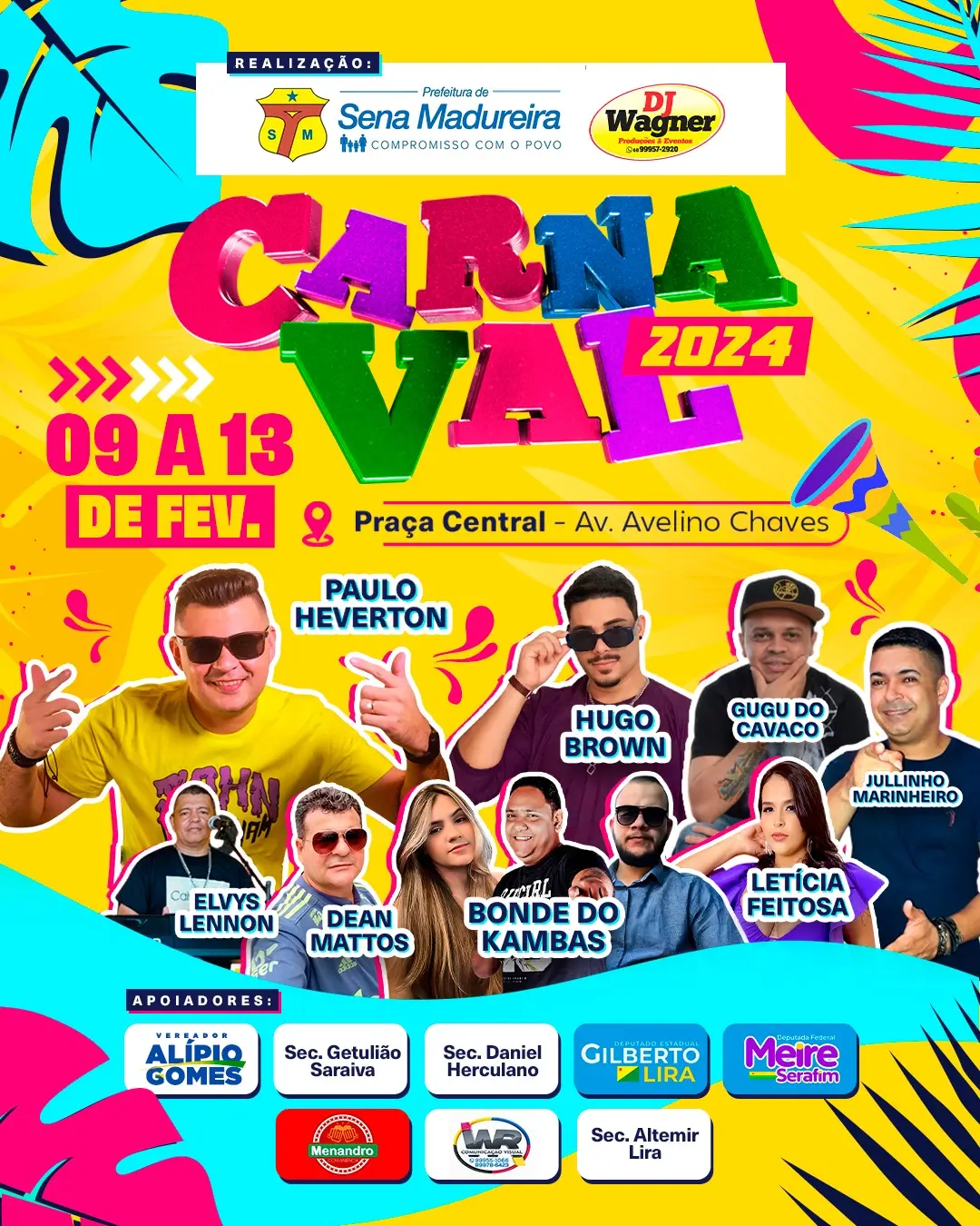 A Prefeitura de Sena Madureira, em parceria com DJ Wagner Produção e Evento, divulgou na noite de hoje (24) a programação oficial do Carnaval de Rua 2024. O evento está marcado para acontecer no palco municipal, em frente à Praça 25 de setembro, entre os dias 9 e 13 de fevereiro.