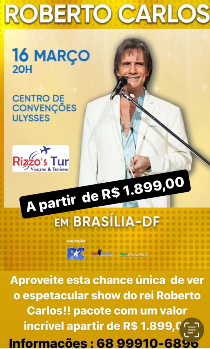 Bombando o pacote de viagens para o show do Roberto Carlos que está sendo vendido pela Agência de Turismo Rizzo’s Tur. O pacote inclui passagem ida e volta para Brasília, hospedagem e ingresso para o show do Rei. Corra e garanta o seu!