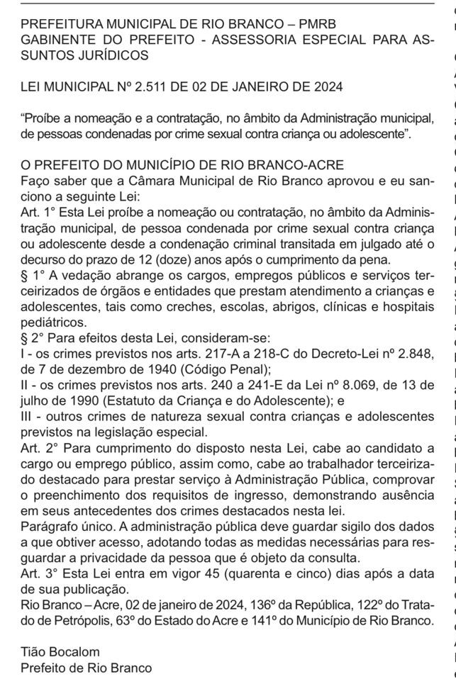 O prefeito de Rio Branco, Tião Bocalom, sancionou no Diário Oficial do Estado (DOE) desta quinta-feira (4) a lei municipal nº 2.511 de 02 de janeiro de 2024, que proíbe a nomeação e a contratação, no âmbito municipal, de pessoas condenadas por crimes sexuais contra criança ou adolescente.