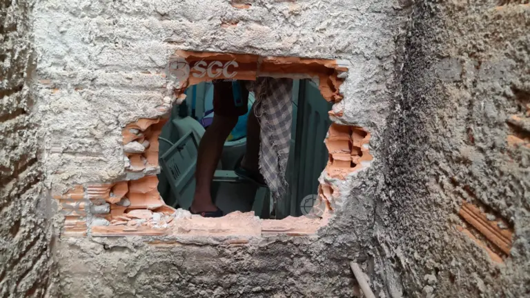 Ao chegar ao local, os militares confirmaram se tratar de um furto, onde os criminosos arrombaram um cofre próximo a um buraco feito na parede. A perícia técnica foi acionada para isolar o local e realizar os procedimentos necessários. Durante a inspeção, ficou evidente que os criminosos escalaram a parede de uma residência, que possuía 6 metros de altura, utilizando uma corda.
